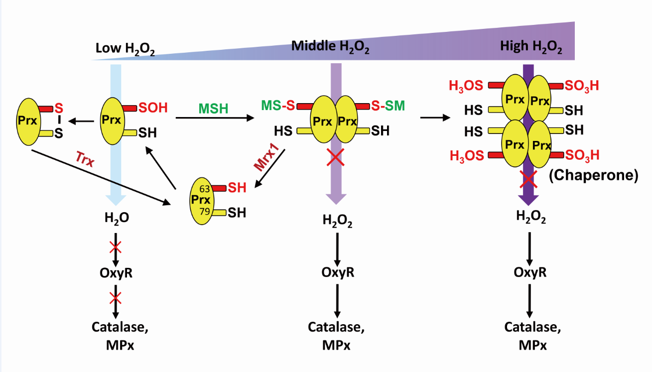 Peroxiredoxins (Prxs)是一类广泛存在的非血红素过氧化物酶家族蛋白,在过氧化氢信号调节、氧化应激、衰老和癌症等方面发挥重要功能。近期沈锡辉教授团队对谷氨酸棒杆菌中一个非典型2-Cys型Prx的功能进行了研究,发现该Prx具有过氧化物酶和分子伴侣双重功能,并在谷氨酸棒杆菌抗氧化胁迫中发挥重要调节作用。在低浓度过氧化氢胁迫下,Prx主要作为单体存在,发挥依赖硫氧还蛋白的过氧化物酶活性;在中等浓度过氧化氢胁迫下,Prx的Cys63残基进行可逆的分支硫醇化修饰,使Prx以既无过氧化物酶活性也无分子伴侣活性的二聚体形式存在,导致胞内过氧化氢水平逐步积累并激活转录因子OxyR,开启了具有更高过氧化氢降解水平的过氧化氢酶KatA和分支硫醇过氧化物酶MPx的表达,以消除过量的过氧化物,随之分支硫醇化修饰的Prx在分支硫醇依赖的氧化还原酶Mrx1作用下去修饰并继续以单体过氧化物酶形式存在;在高浓度过氧化氢胁迫下,Prx的Cys63会被过度氧化为不可逆的磺酸并丧失过氧化物酶活性,但也获得了以多聚体形式存在的分子伴侣功能,帮助氧胁迫受损蛋白进行正确折叠。