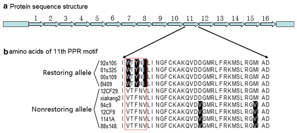 Pol CMS 是傅廷栋教授1972年发现的第一个有实用价值的甘蓝型油菜胞质雄性不育类型,后被转育到大白菜等十字花科蔬菜作物中,是目前大白菜育种中重要的不育源之一。张鲁刚教授团队通过恢复基因等位性分析,在4个大白菜pol CMS的恢复系中鉴定出了2个恢复基因位点,分别命名为 BrRfp1 和 BrRfp2 。团队进一步通过构建BC1和BC1F2两个精细定位群体,结合基因组重测序,对恢复基因位点 BrRfp1 进行了精细定位,确定大白菜A09染色体上的一个PPR基因(LOC103843088)是恢复基因候选基因。通过比对候选基因在恢复系和非恢复系中的序列差异,在候选基因第11个PPR基序中发现了3个氨基酸残基的突变存在于所有的非恢复材料中,可能是导致基因恢复功能丧失的原因。根据候选基因在恢复系和非恢复系中的序列差异,团队还开发了一个检测恢复基因 BrRfp1 是否存在的显性标记SC718。该研究对于深入研究 pol CMS/ Rf 系统的分子机理有重要意义。