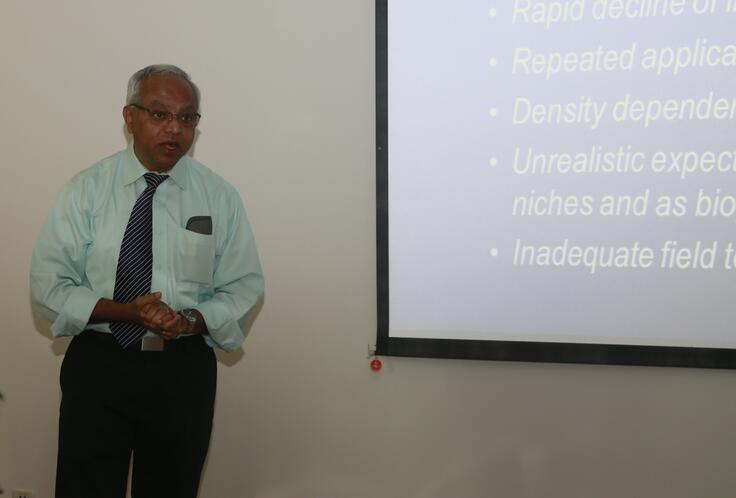 5月22日,美国加州大学戴维斯分校植物病理学系Krishna V. Subbarao教授应邀来我室做了题为“Can indigenous soil microbiomes deliver the promise of biocontrol”的学术报告,胡小平教授主持报告会。